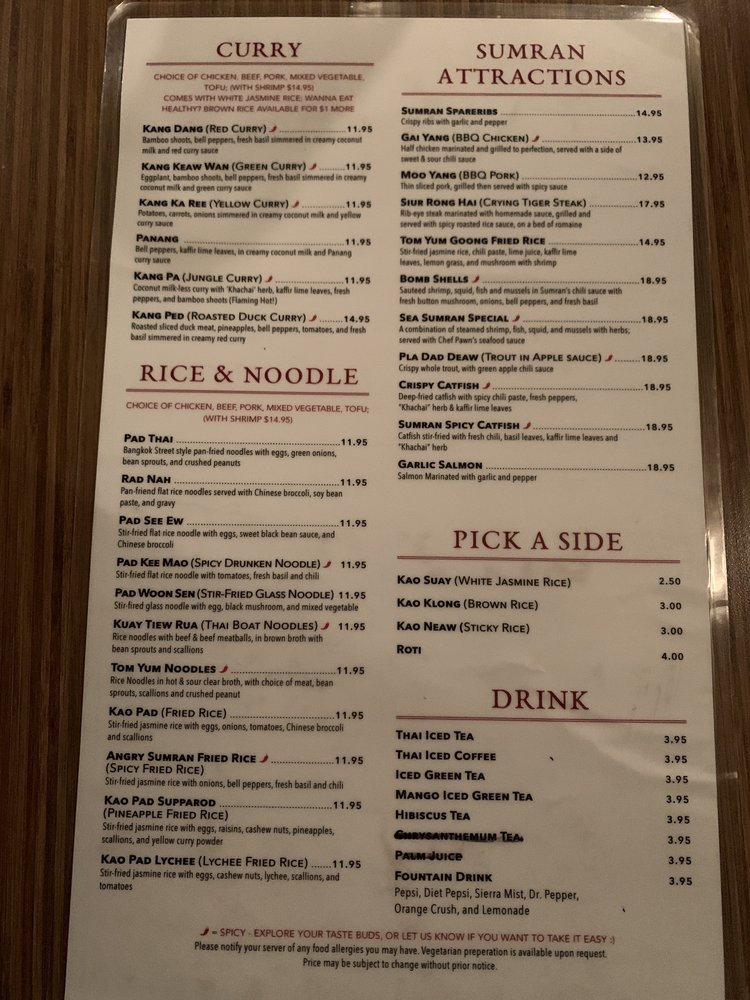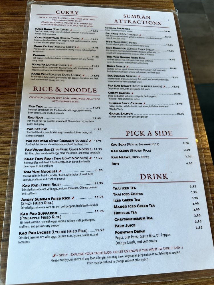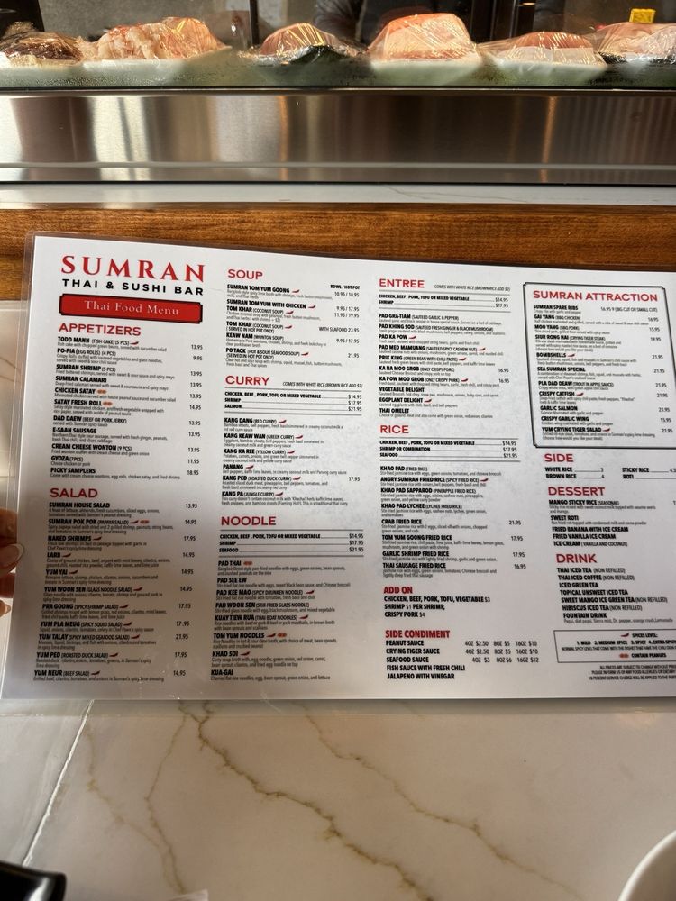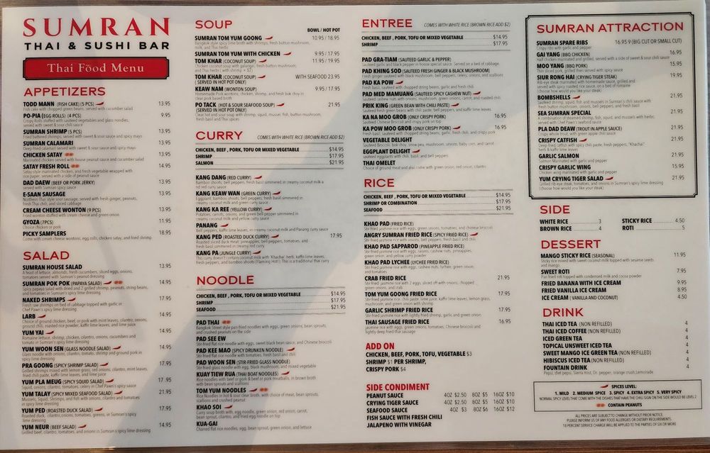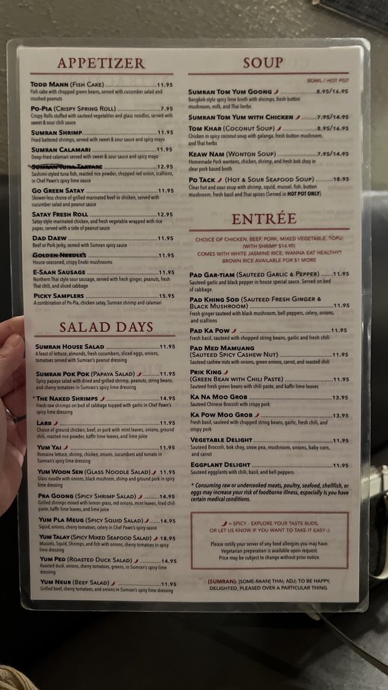 Welcome to Sumran Thai Cuisine, a hidden gem in Westminster, CA, offering a diverse menu with options for everyone. This casual yet stylish restaurant provides a cozy ambiance with excellent service. Sumran's lunch specials are a highlight, with dishes like Thai BBQ Chicken and Green Curry Chicken priced at $11.95. The appetizers, such as Fish Cake Tod Mann and Sumran Shrimp, are flavorful and satisfying. Salad lovers will enjoy the Sumran House Salad and Papaya Salad with a spicy kick. Customer reviews rave about the fantastic food and service, making Sumran a go-to spot for many. Don't miss out on the newly added sushi bar, adding even more variety to the menu. Sumran Thai Cuisine is a must-visit for authentic Thai flavors in a welcoming setting.