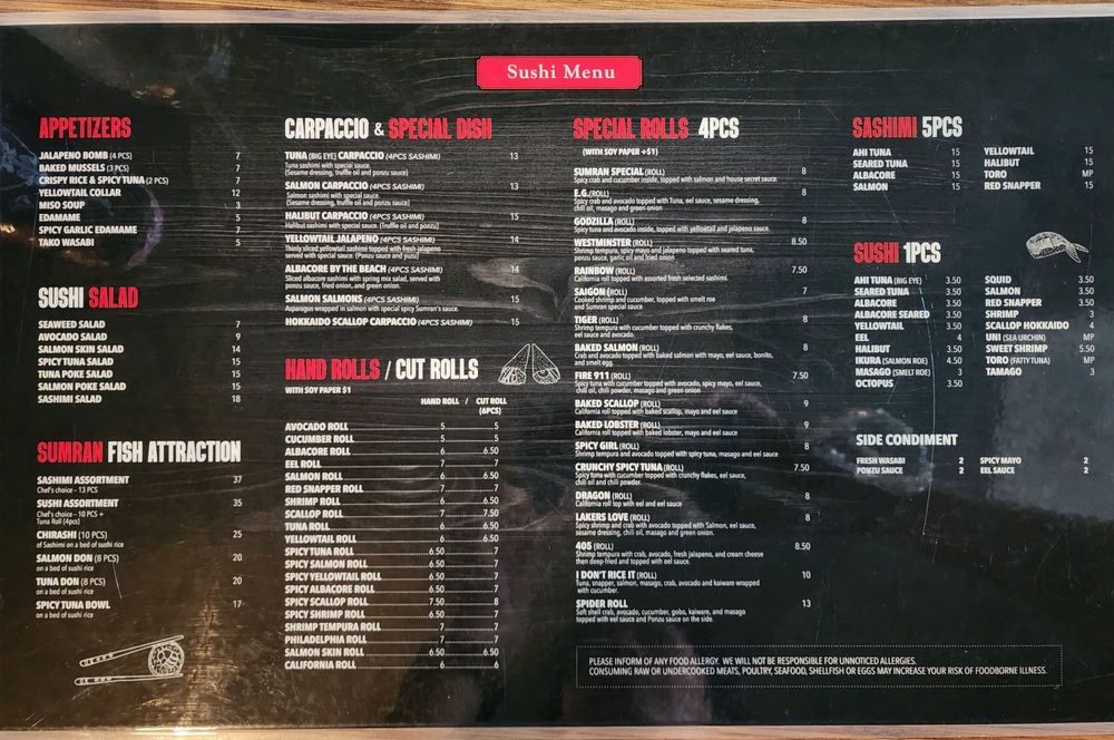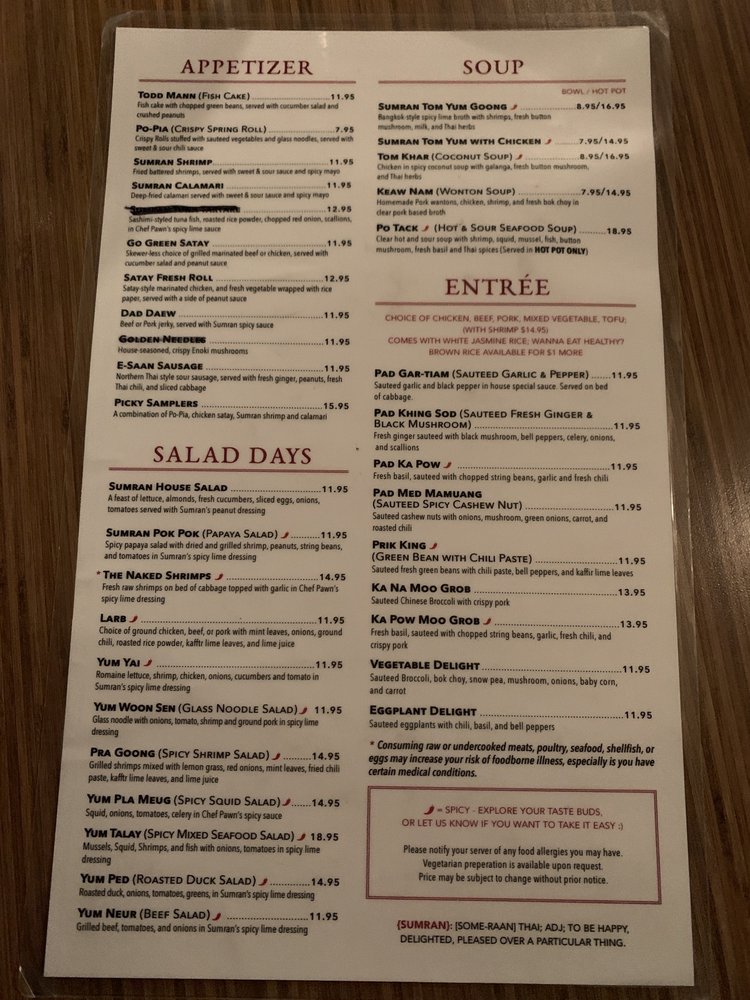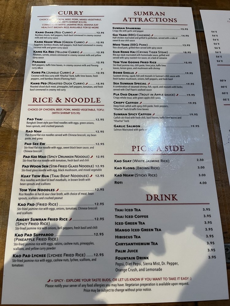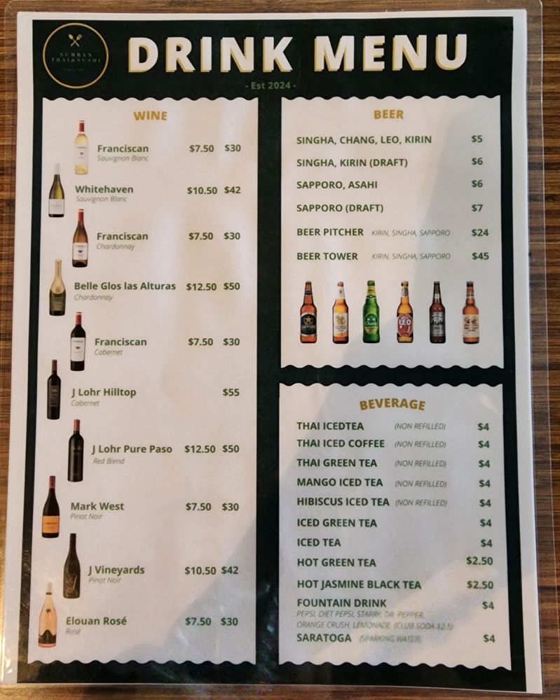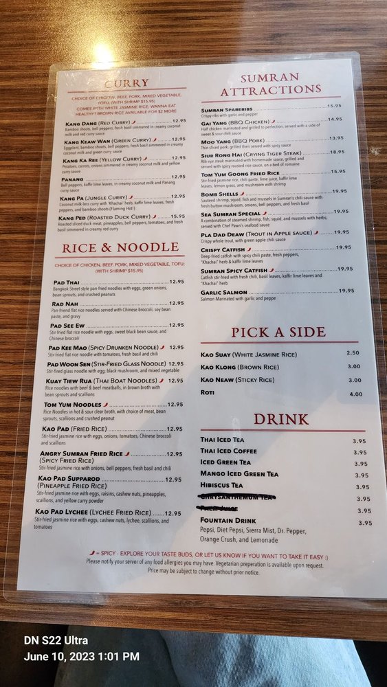 Welcome to Sumran Thai Cuisine, a hidden gem in Westminster, CA, offering a diverse menu with options for everyone. This casual yet stylish restaurant provides a cozy ambiance with excellent service. Sumran's lunch specials are a highlight, with dishes like Thai BBQ Chicken and Green Curry Chicken priced at $11.95. The appetizers, such as Fish Cake Tod Mann and Sumran Shrimp, are flavorful and satisfying. Salad lovers will enjoy the Sumran House Salad and Papaya Salad with a spicy kick. Customer reviews rave about the fantastic food and service, making Sumran a go-to spot for many. Don't miss out on the newly added sushi bar, adding even more variety to the menu. Sumran Thai Cuisine is a must-visit for authentic Thai flavors in a welcoming setting.